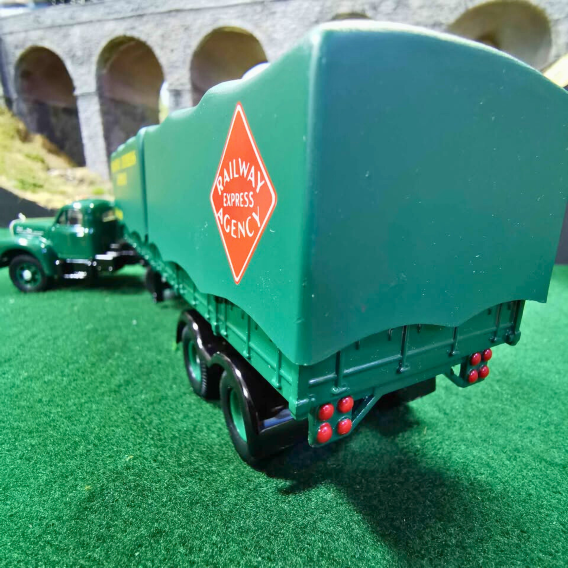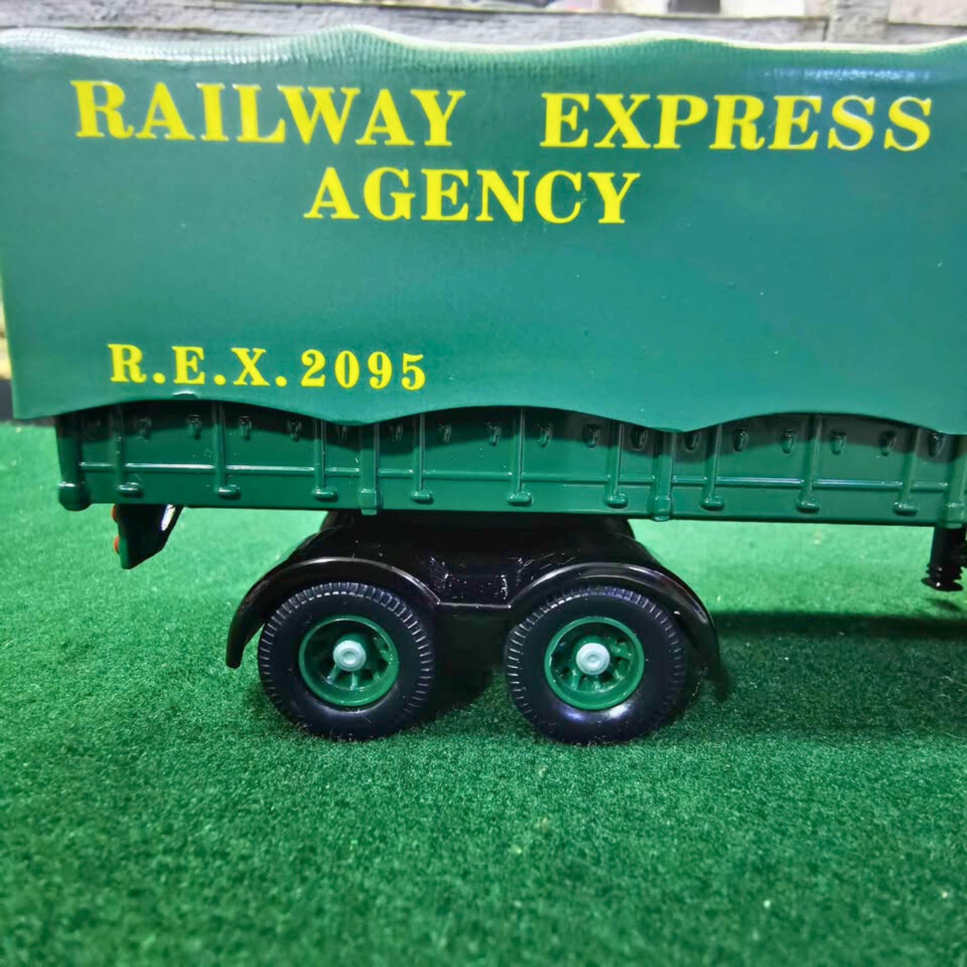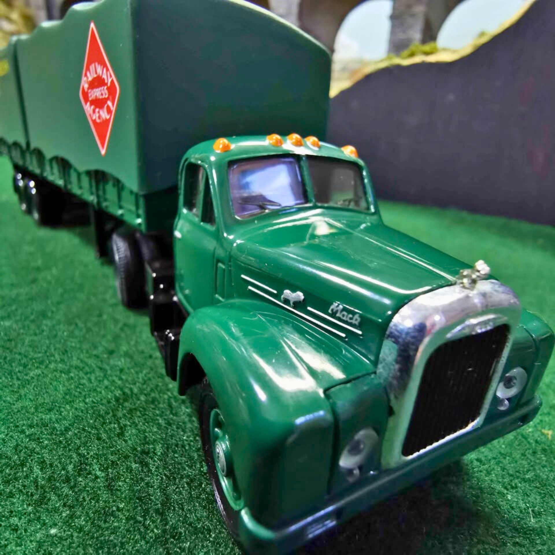 This exceptional Corgi Classics diecast model captures a vintage Railway Express Agency Mack B articulated lorry in authentic green livery. Presented in pristine, unmarked condition, this pre-owned collectible arrives in its original box accompanied by a numbered limited edition certificate, authenticating its place within the series. A distinguished addition to any model railway or transport collection, reflecting meticulous craftsmanship and historical significance.