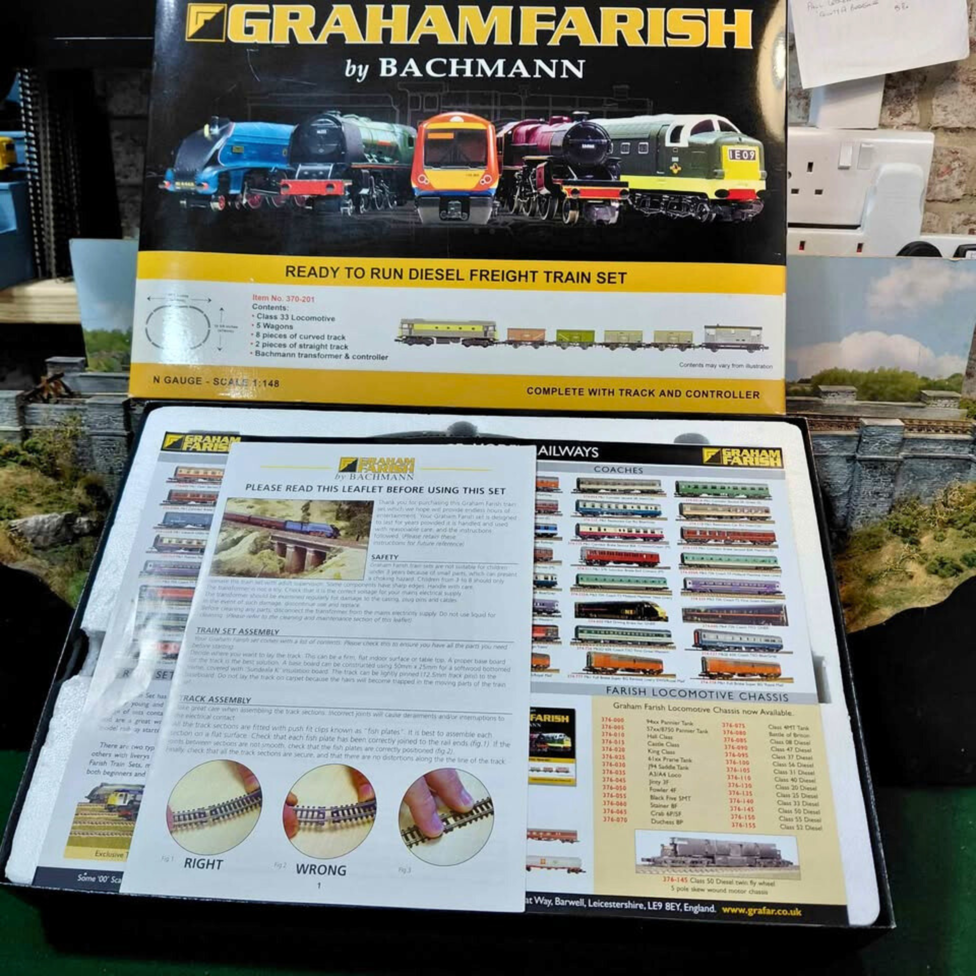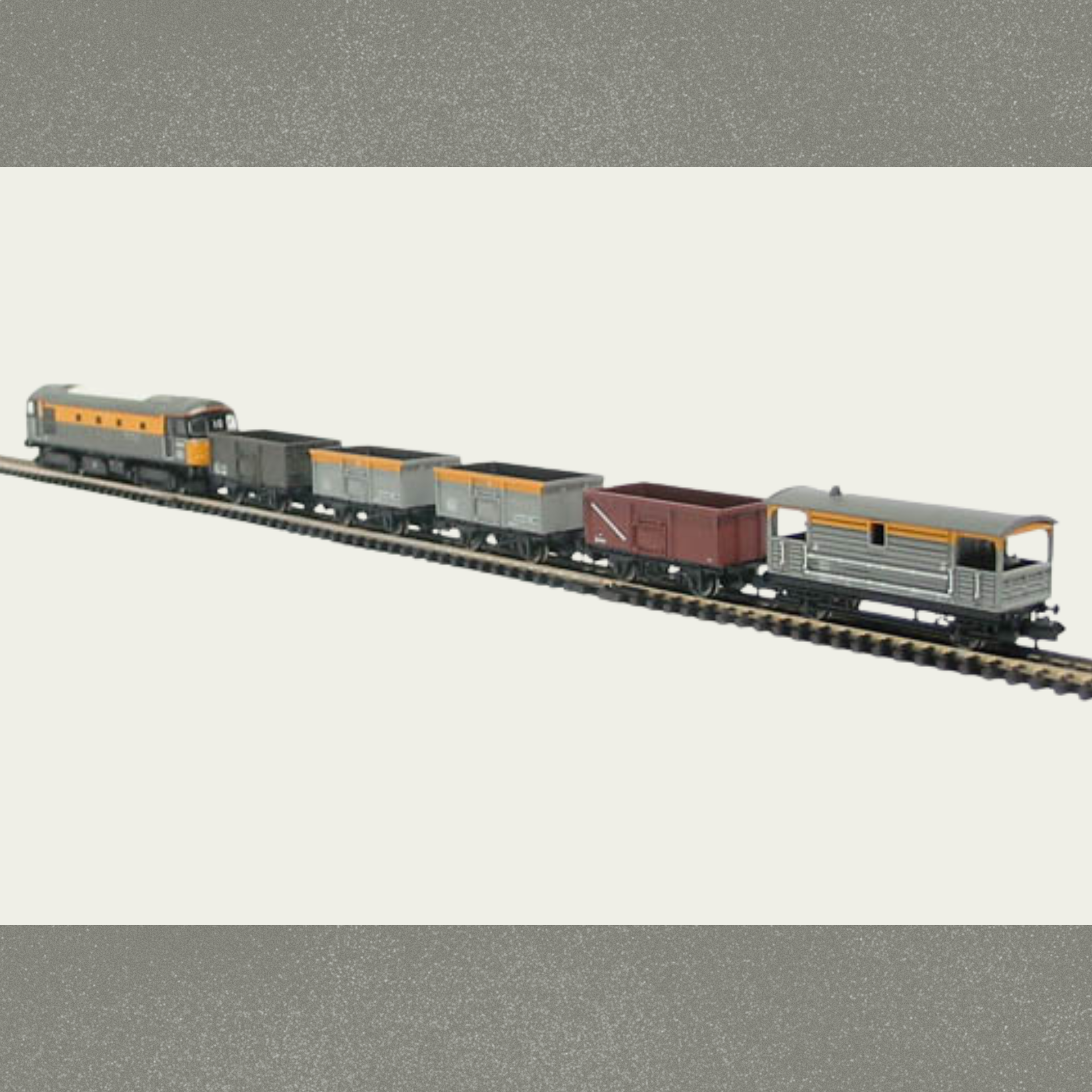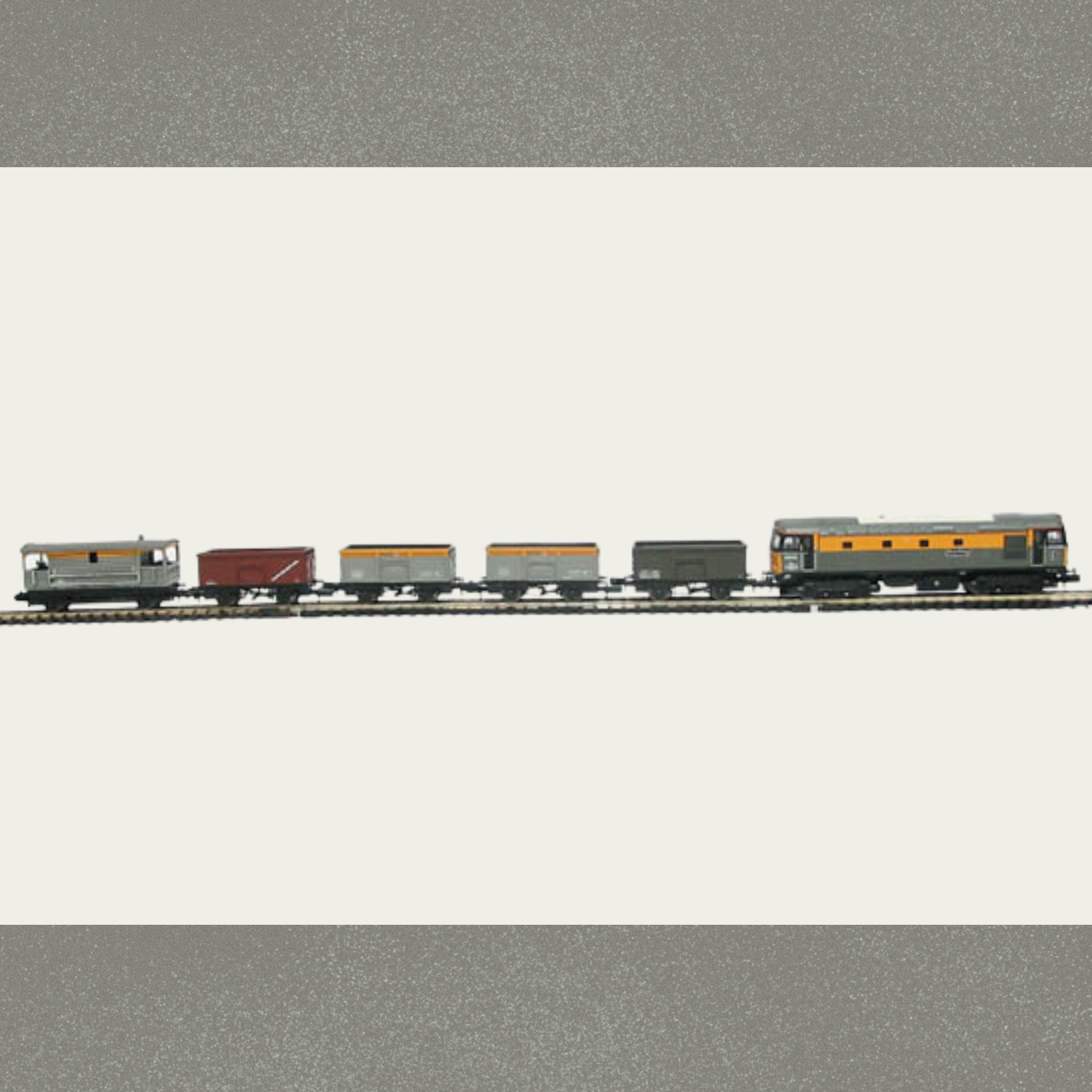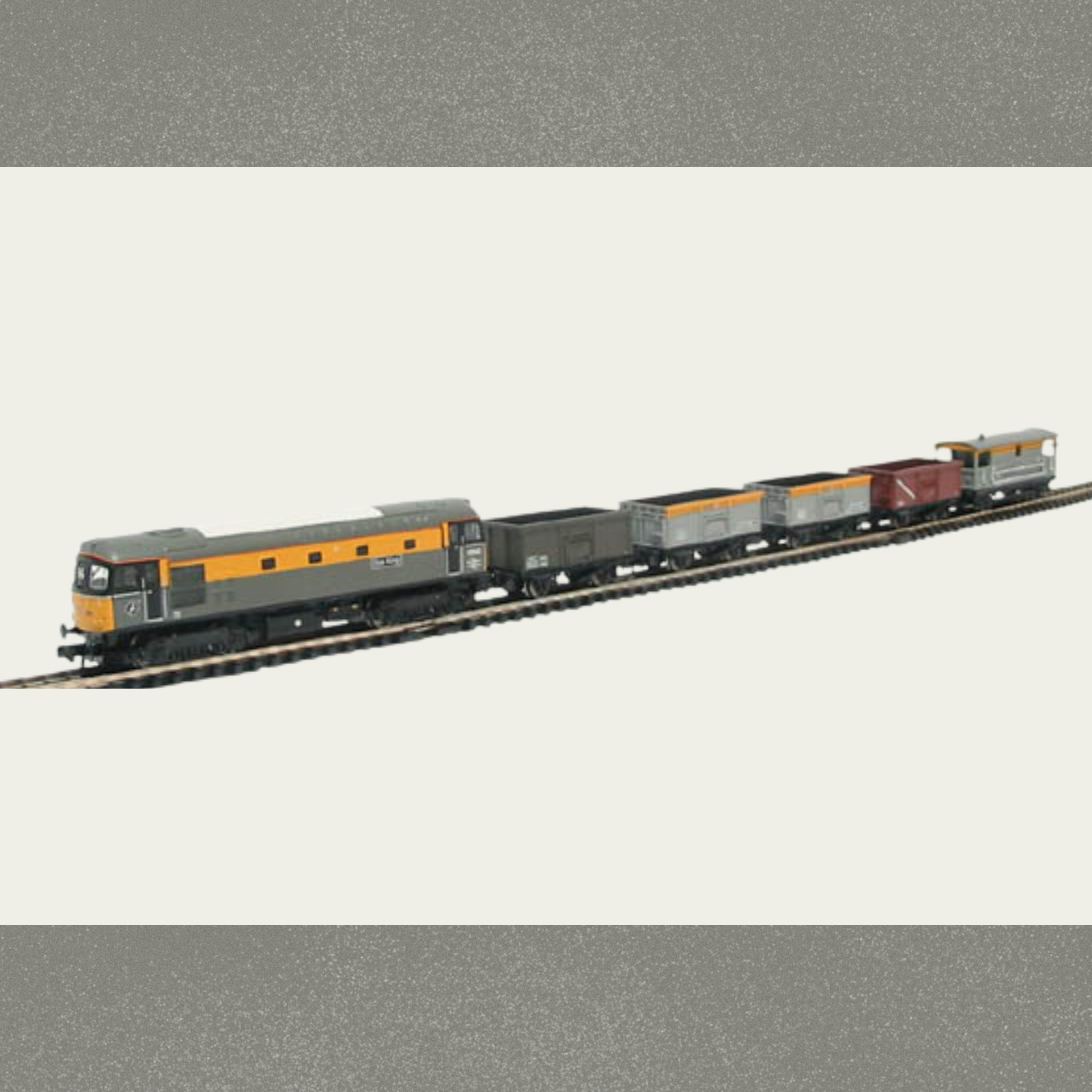 Ready to run diesel freight train set that includes: Class 33 Sea King locomotive, 5 wagons, 8 pieces of curved track, 2 pieces of straight track with a Bachmann transformer and controller. This rare set is in absolute pristine working condition throughout.