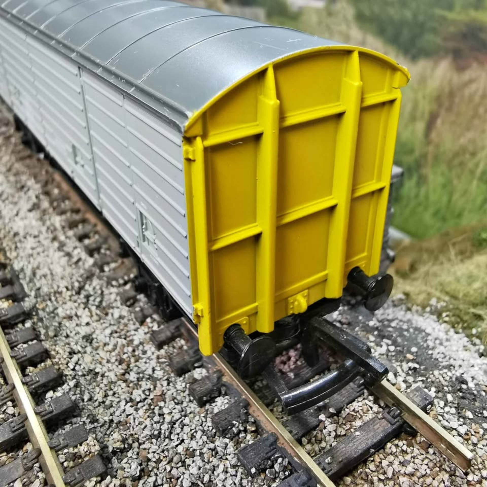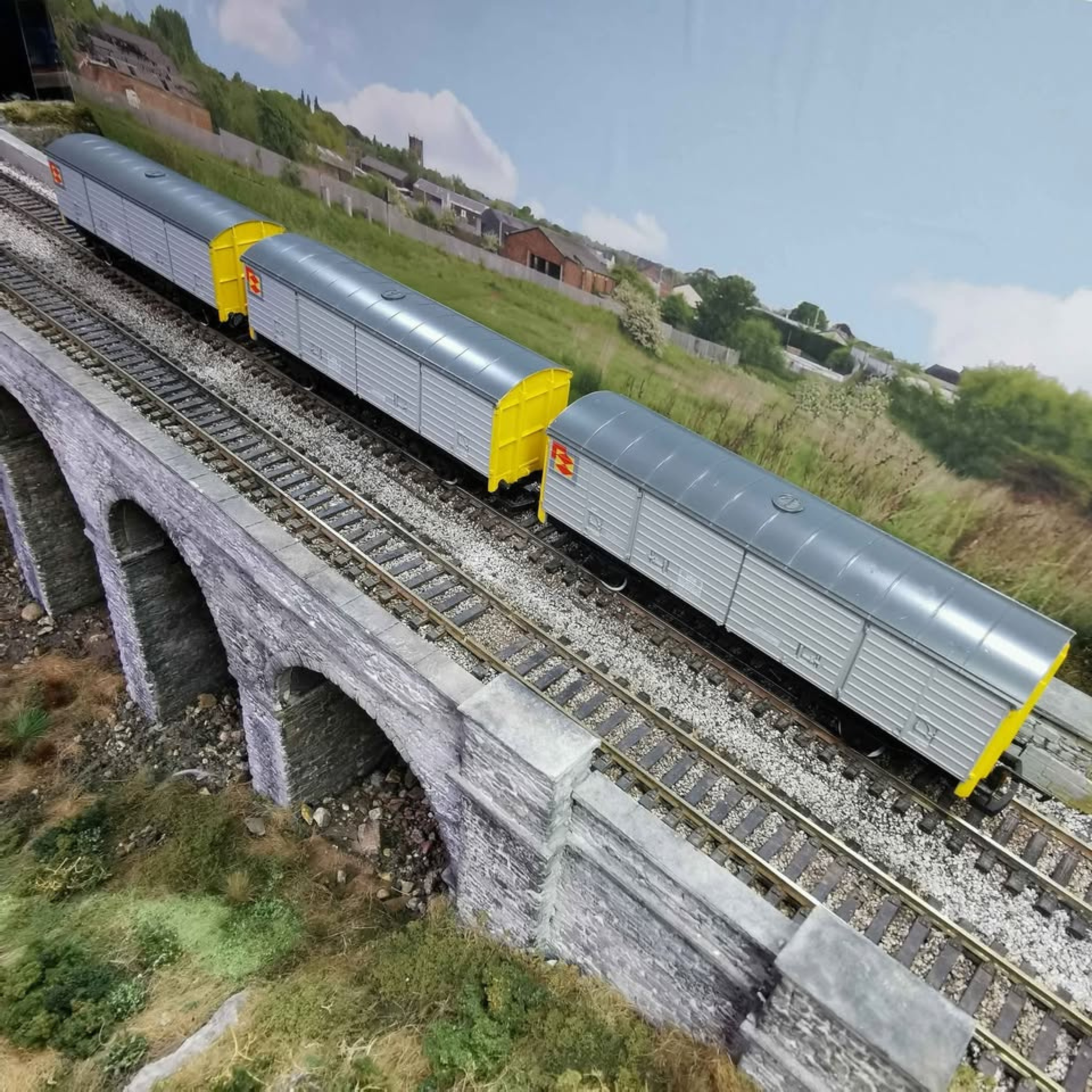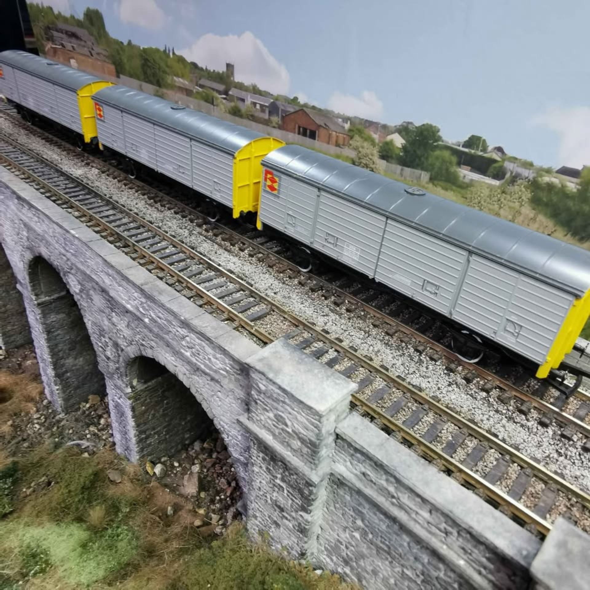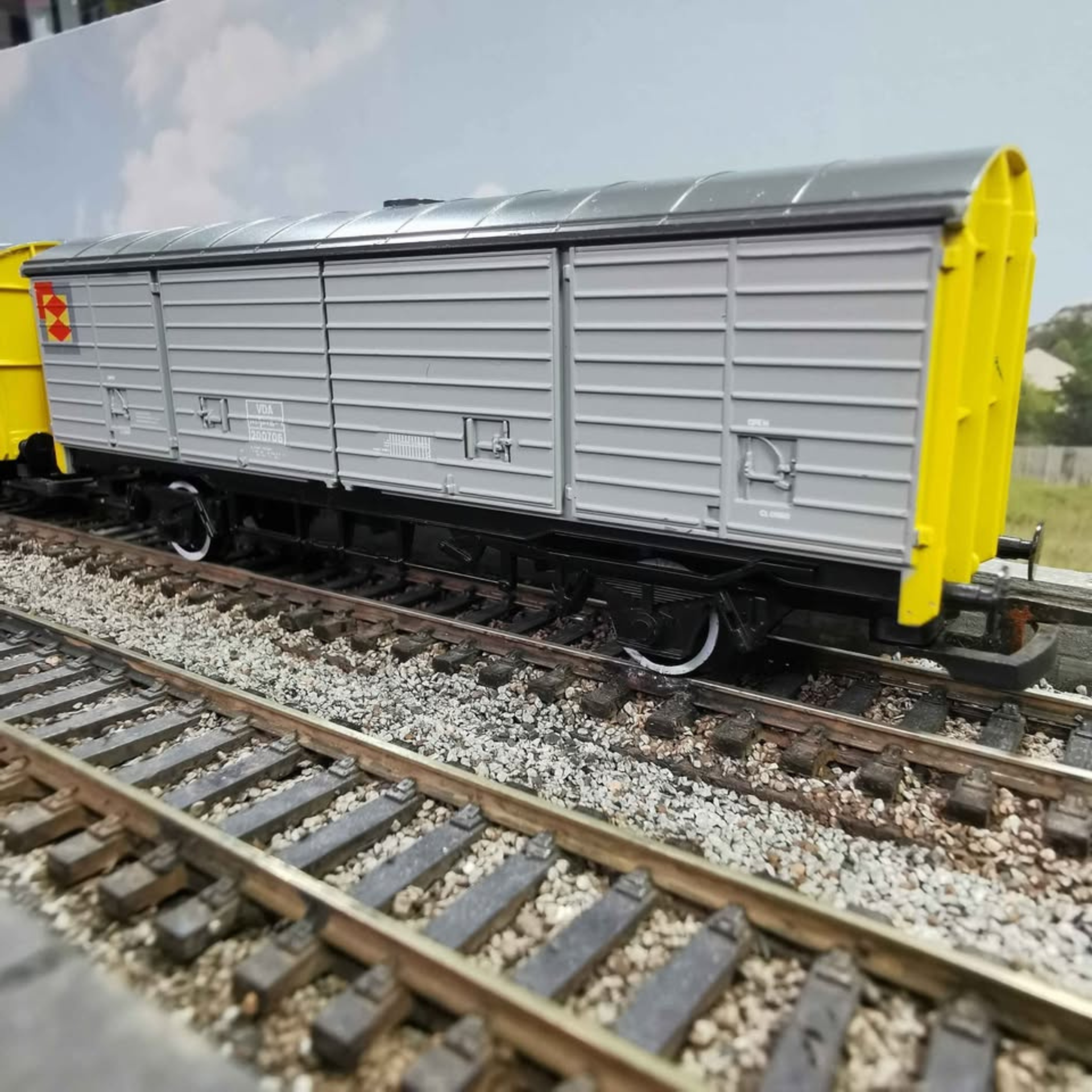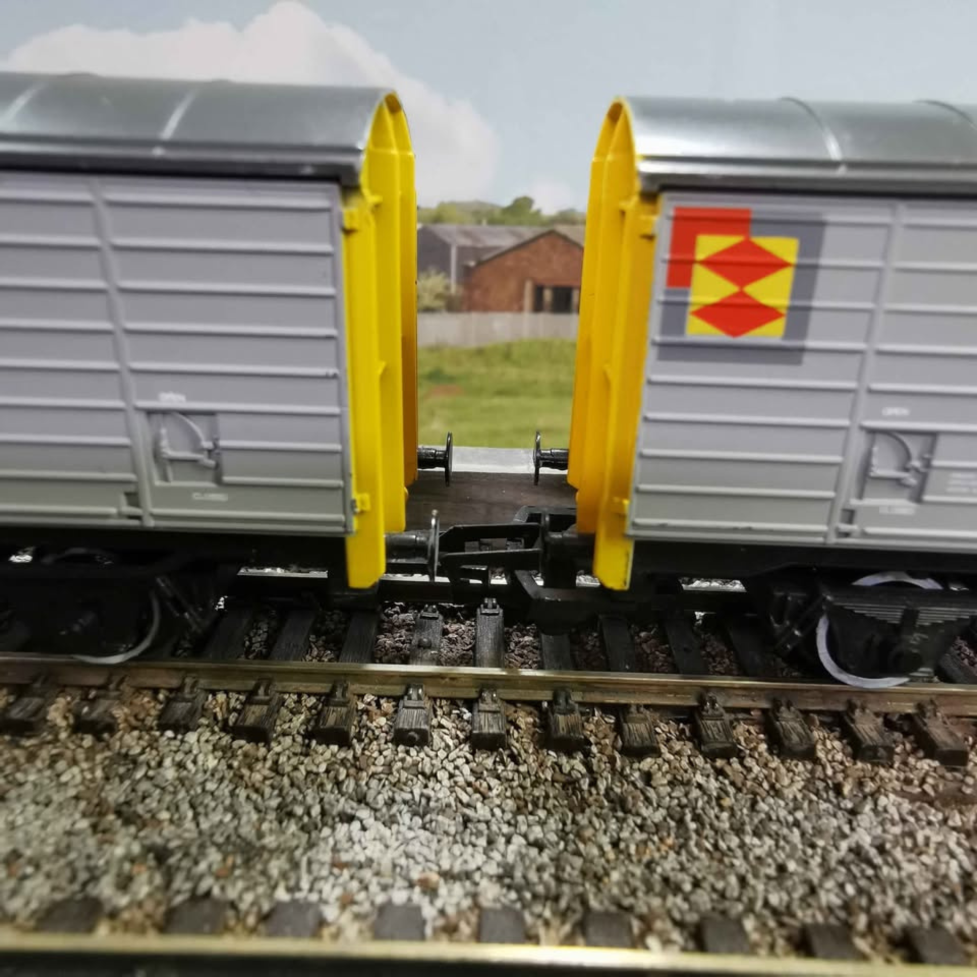 These Hornby 45-ton VDA closed vans in Railfreight livery, built to OO gauge, make a refined addition to any model railway. Offered at £12 each, a set of three is available for purchase. All vans are in very good pre-used condition with intact buffers, though one van is missing a hook on its coupling. Original packaging is not included. You may select a quantity of one, two, or three to suit your collection needs.