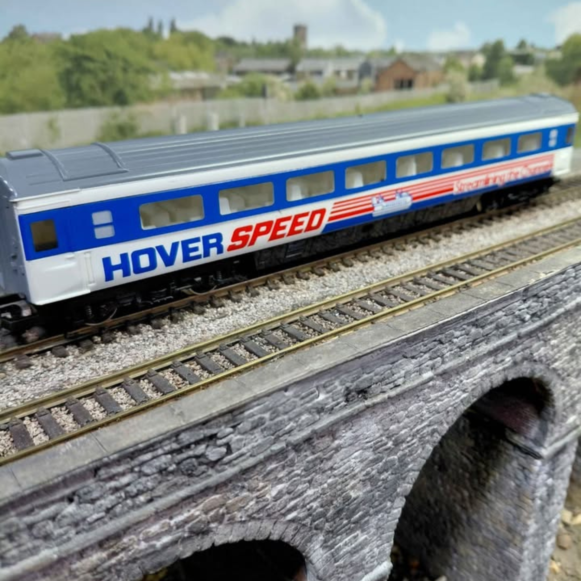 A distinguished Hornby Railways Mk.3a open coach finished in authentic Hoverspeed livery, presented in exceptional pre-used condition. This OO gauge model (R.454) showcases meticulous detailing characteristic of Hornby's heritage collection. Originally boxed, the piece remains pristine throughout, making it an excellent addition for discerning model railway enthusiasts and collectors seeking quality vintage stock in outstanding condition.