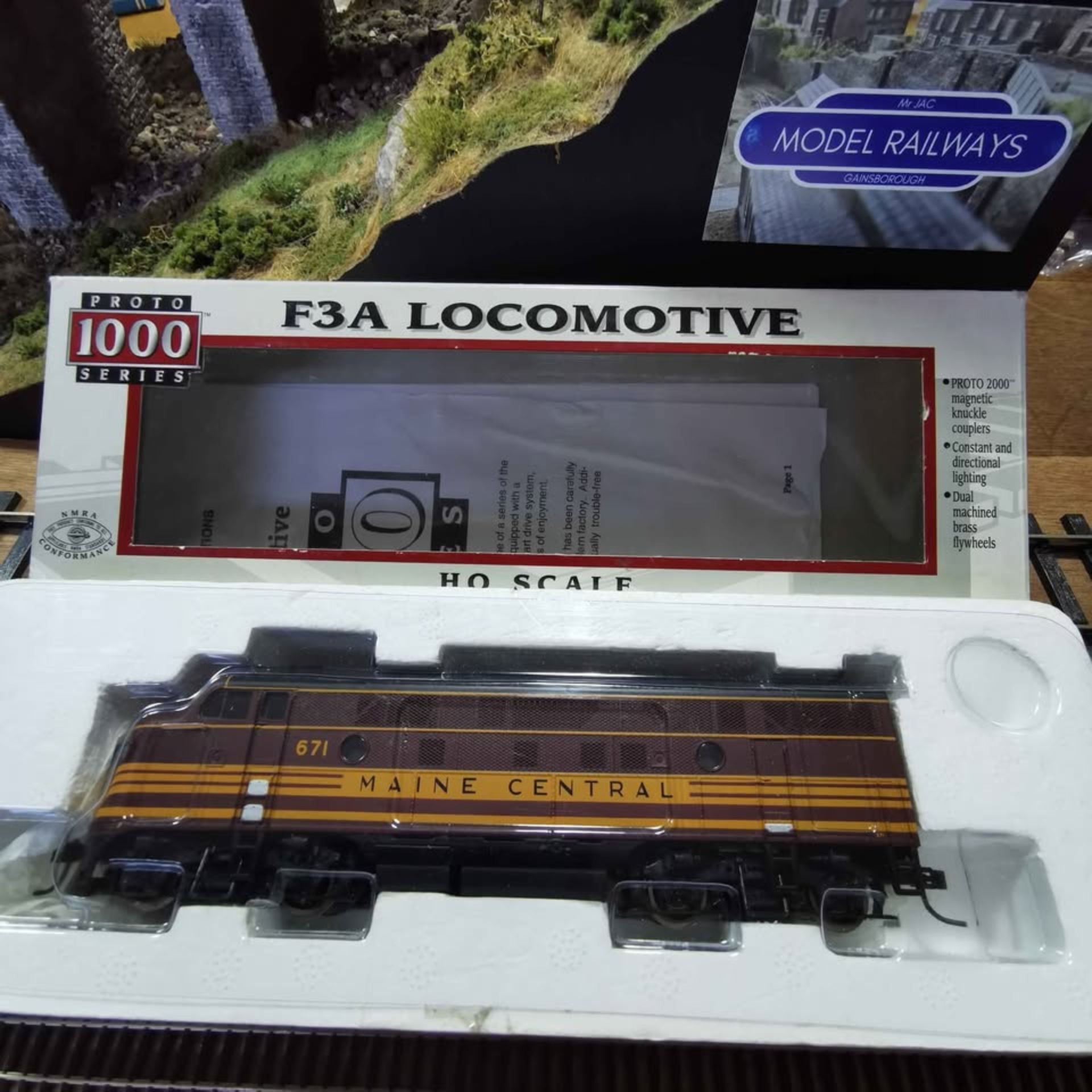 The Proto 1000 Series F3A and F3B powered locomotives in Maine Central livery, both numbered 671, offer exceptional craftsmanship for HO scale enthusiasts. Featuring magnetic knuckle couplers, dual machined brass flywheels, and a five-pole skew wound armature, these models deliver smooth, reliable operation with directional lighting and a heavy die-cast chassis. The eight-wheel drive and pickup system ensures effortless rolling at all speeds in either direction. Both locomotives come presented in their original packaging, making them a distinguished addition to any collection.