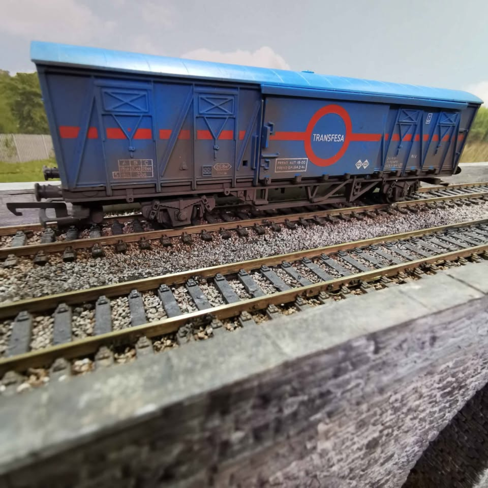 The Hornby Weathered Ferry Van in Transfesa livery is a detailed OO gauge model featuring authentic working sliding doors. Carefully weathered to reflect realistic operational wear, this unboxed piece retains all its buffers and couplings intact, making it ideal for discerning collectors or model railway enthusiasts seeking to enhance their layouts with a touch of authenticity and functional precision.