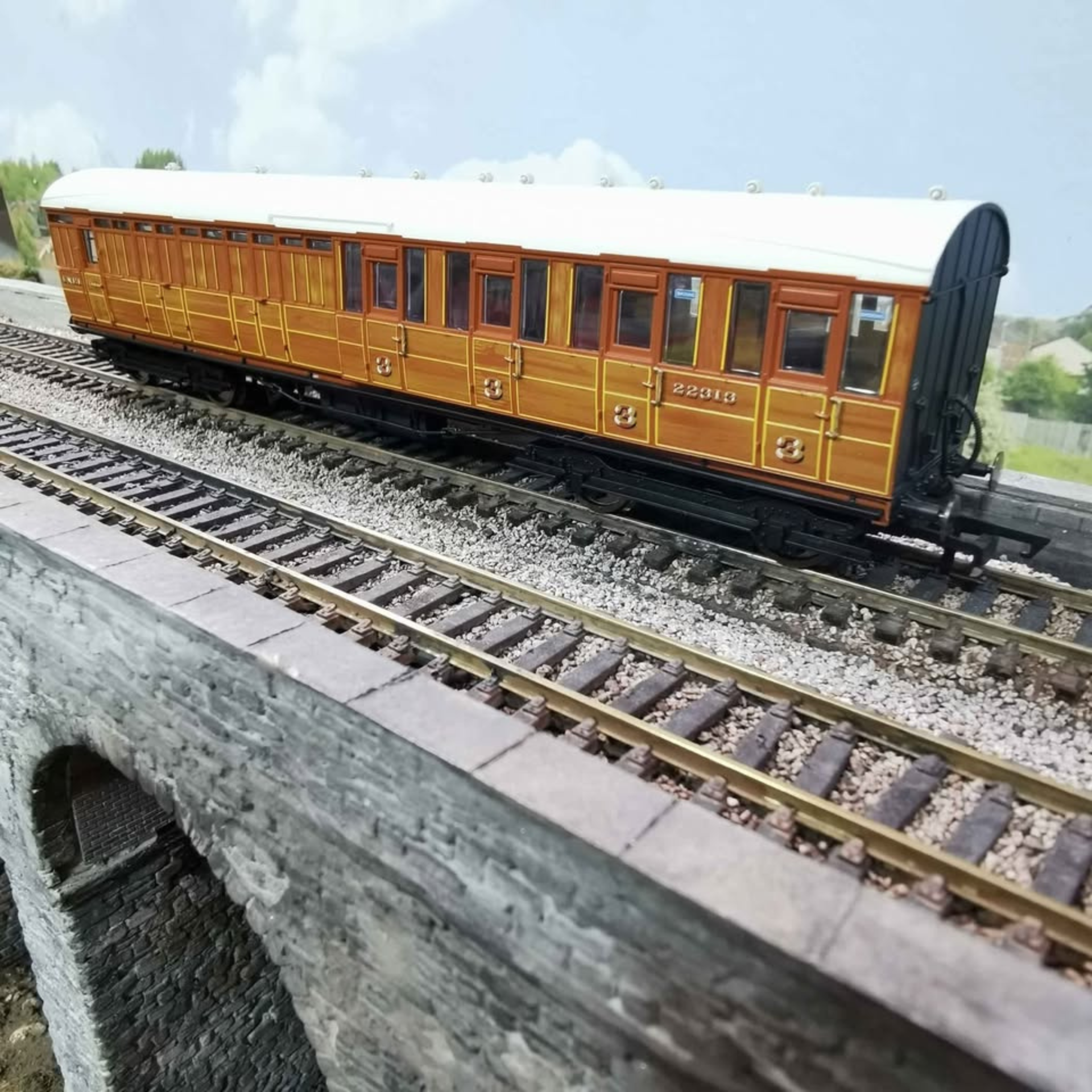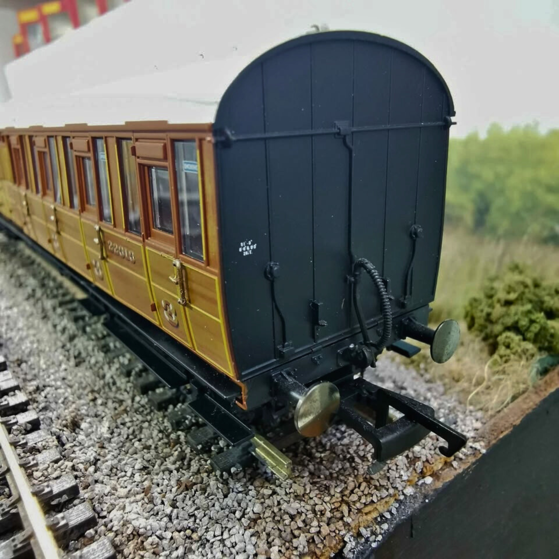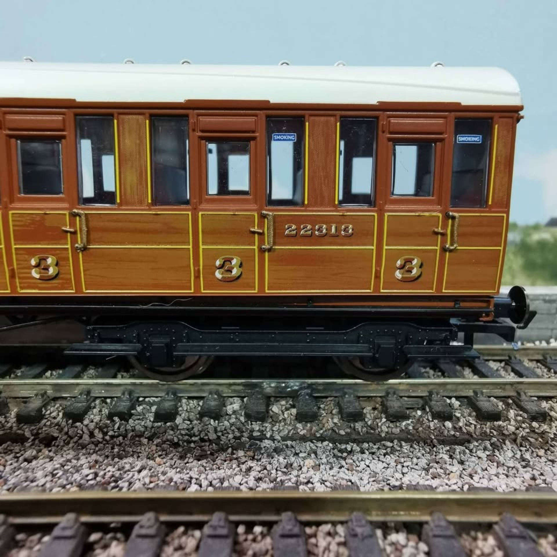 The Hornby LNER Gresley Suburban 3rd Class Brake Coach No. 22313, presented in pristine condition, showcases detailed craftsmanship with NEM couplings, metal wheels, and sprung buffers. This OO Gauge model offers both authenticity and durability, making it an excellent addition to any discerning collector's layout. The packaging shows minor creasing but remains largely intact, preserving its overall presentation.