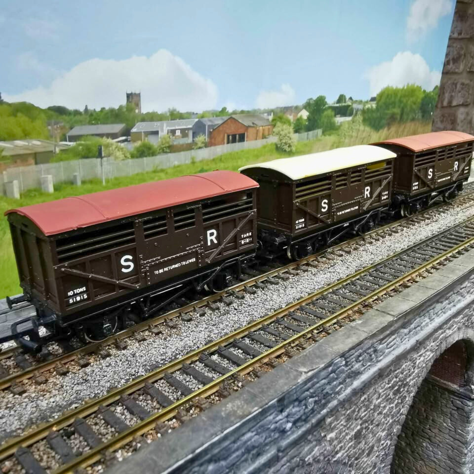Authentic Hornby Railways Southern Region sheep wagons in OO gauge, presented in excellent pre-owned condition. Each wagon retains its original buffers and couplings in full working order. Select between classic cream or russet roof variants to compliment your collection or layout scheme. Meticulously preserved examples that capture the character of heritage railway stock. Verify your preferred colour and quantity selection prior to purchase.